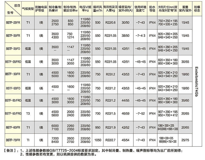 電力專(zhuān)用防爆空調(diào)主要型號(hào)及技術(shù)參數(shù):